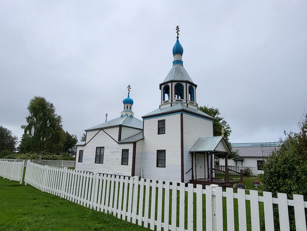Die Berge sind am nächsten Morgen immer noch in Wolken gehüllt und es regnet. Wir machen uns deshalb auf den Weg in Richtung Soldotna und Homer. Am Kenai River, einem Angler und River Rafting Paradies, wo sich Campingplatz an Campingplatz reiht, scheint doch tatsächlich die Sonne und es keimt die Hoffnung, dass das Wetter besser wird als vorausgesagt. Allerdings war das nur ein kurzer Lichtblick, denn schon in Soldotna regnet es wieder in Strömen. Wir fahren trotzdem nach Kenai und von dort nach Norden, bis zum Captain Cook State Recreation Area. Vom Campingplatz am Cook Inlet, wären bei schönem Wetter auf der anderen Seite des Fjords die schneebedeckten Gipfel der Alaska Range zu sehen. Bei einigen der Berge handelt es sich um Vulkane die, als Fortsetzung der Aleuten, zum Pazifischen Feuerring gehören und auch immer mal wieder aktiv sind. Der Anblick bleibt uns, wegen Dauerregen und tiefhängenden Wolken, verwehrt. Wir fahren deshalb am nächsten Morgen zurück nach Kenai und schauen uns da die Russisch-Orthodoxe Kirche und die kleine, ebenfalls Russisch-Orthodoxe, Kapelle an. Bis 1867 gehörte Alaska nämlich zu Russland und wurde am 9. April 1867 für 7,2 Millionen US-Dollar (entsprach 2016 inflationsbereinigt 140 Mio. USD) von den Russen an die USA verkauft. Am 3. Januar 1959 wurde Alaska als 49. Bundesstaat anerkannt. Zum alten Dorfkern um die Kirche und die Kapelle gehören auch noch weitere, teils restaurierte Holzhäuser.
